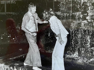 Photo unearthed: Dad soaked, in bare feet, balancing or dancing on a brick wall with an attractive young woman. The circumstances? Who knows? Perhaps my mother would have liked to know.