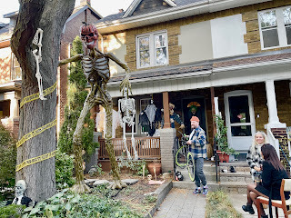 My neighbour's massive Hallowe'en display with fifteen-foot-high monster is up already. Slow down! It's coming soon enough!