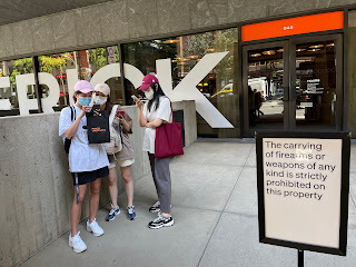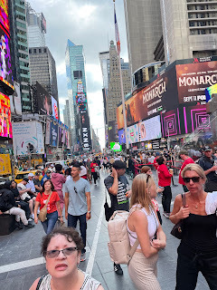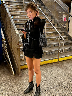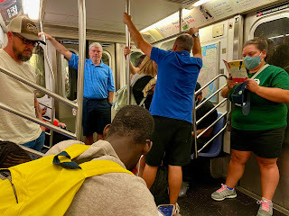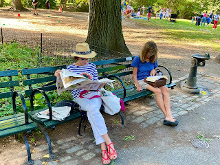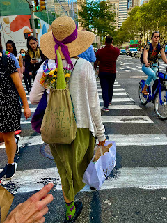 On the subway platform, the New York look in the heat - earbuds, phone glued in hand, very short skirts or shorts, cowboy boots. Lots of women wearing nearly nothing - bra-like tops, tiny shorts or skintight workout gear. People of indeterminate sex, a bearded man today in a long flowing gown. What everyone has in common is moving fast. Except for this Torontonian, meandering. Some NYC pictures