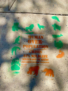 Sidewalk stencil, a desperate message: "Human over-population crisis, 52% wildlife killed off in 40 years." Does anyone notice?