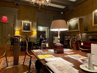 Walked from the library to Ted's old, stately club, the Century Club on W. 43, for (wealthy) artists or people in arts related businesses, patrons and such. Paradise, out of the maelstrom - while I waited for him and Henry, sat in the reading room with newspapers, The London Review of Books, the Times Literary Supplement. Could live there for a week or two. And then we had a delicious dinner. Ted's on the board. The service was great.