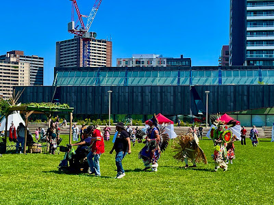 On Saturday, which was very hot, there was a powwow just down the street in the Regent Park park, and my daughter's group was providing the food. There she was in her ribbon skirt, grilling bison burgers, which were delicious. There was a big Indigenous crowd, many dancers in jingle dresses or feathers, lots of kids, loud drumming. At the same time, the big Muslim population of Regent Park was also out, so there were women in niqab, boys in long white tunics with little white caps ... and many others of all nationalities. As always, I marvelled at the diversity of my city and especially my neighbourhood.