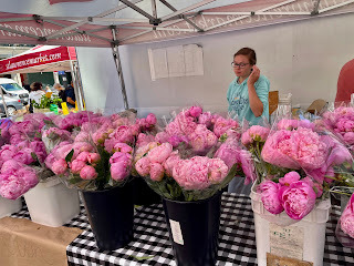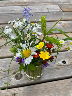 Picked for our table.I used the Merlin app to find out what birds were around, besides the jays, crows, and robins, and found the red-eyed vireo, Eastern phoebe, common yellowthroat, magnolia warbler, and ovenbird. I've never even heard of some of them. And, obviously, somewhere, a wild turkey shedding feathers.