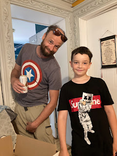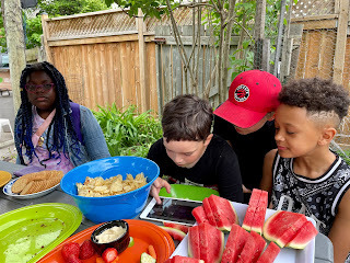 My older grandson is now ten, wearing size 12. Anna told me, "I have to buy him deodorant. I'm not ready for this!" The party, after school on Friday, was the usual organized yet free-flowing madhouse, a United Nations of children piling into the yard and the laneway behind, for basketball, skateboarding, biking, trampolining, and some game invented by Eli. Anna kept producing food and the kids kept going, while a few parents had a beer in the shade. Anna tells parents if they want to leave their kids and go off to enjoy some quiet time, please do. And they do.