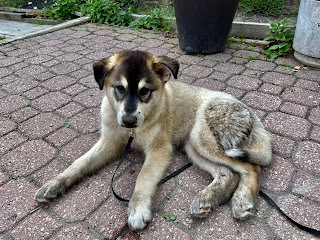 Anna and the boys are in Nova Scotia, I gather having a superb time; she posted a picture of herself on a beach with a fresh oyster and a Keith's beer, Anna's definition of heaven. Sam came over yesterday with his Bandit shadow. At one point he went out for a bit and left Bandit with me. The pup pressed himself by the closed door, lifted his head, and howled some puppy howls, showing his wolfy roots: OOOOOOO. Eventually he settled down, lay his head on his water dish, and waited for his human to return.