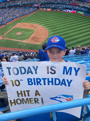 Birthday boy and his dad Thomas.One of Eli's birthday presents from his mama and me is a trip for him, Anna, and Ben to Nova Scotia next week, to visit dear friends there. And from Holly, the thrill of a Jays game for the whole family.