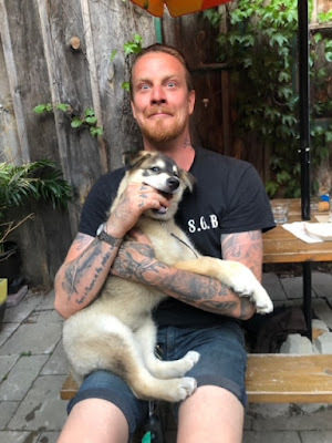 The garden is bursting forth. It's 30 degrees, the humidex 35 today, hotter tmw, but it's a blip, will cool down Wednesday. To brighten your day: a man of my acquaintance and his pup.