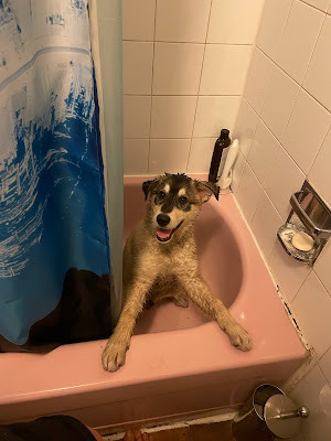 A final bit of happiness, to offset anything bad you may be feeling today: yesterday was record-breaking hot, so Sam cooled Bandit down in the bathtub. If that's not a gleeful face to make you smile ... Even with a Con majority barreling at us. Sob.