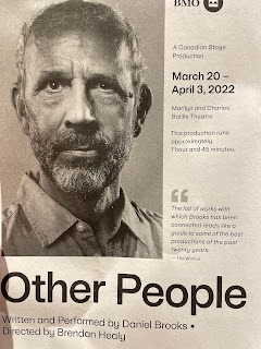An unforgettable experience last night: a haunting piece of theatre. Ruth and I went to see the one man show Other People, written by and starring Daniel Brooks. There's an extraordinary backstory to this event: 63-year old Daniel, one of Canada's best-known and most experienced playwrights and directors - and a non-smoker - has been diagnosed with Stage 4 - terminal - lung cancer.