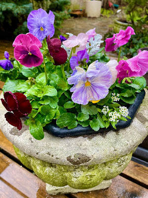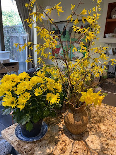 But today! It's a true spring day, brisk but sunny. I joke that usually at 9 a.m. on a Monday it's winter and by noon it's summer; spring was a few hours that morning. But this year, day after day, we've had a real spring, warm, cold, drizzly grey, hot sun. The garden is springing into green. I've forced some forsythia and cut some daffs along with the mums to bring such welcome colour inside. At last.