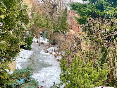 What a day - 17 degrees! We all poured out into the sun. It'll get cold again, but we felt the dawn of hope. I actually did some pruning of the winter kill and saw green shoots, though most of my yard is still covered in slush and ice.