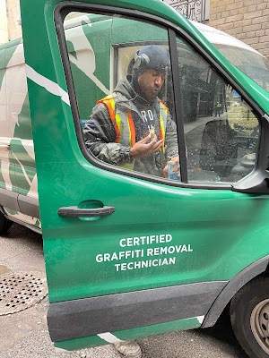 Tonight, the last home class of term, a group of writers like family. Yesterday to the Y that's gradually feeling like normal — had my first sauna in two years, with a passel of naked ladies without masks. Heaven. On the way to the streetcar I passed this fellow. A modern kind of expert. Certified!