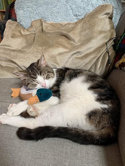 In the meantime, here's my current furry grandbaby, the not-so-dying cat, who still vomits regularly but otherwise is a happy beast. I used to have a collection of stuffed ducks, because ducks can fly, walk, and swim and have such a perfect shape. Here's Naan with one of them. Does this pic not make your day?