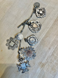 Sam loves old family artefacts and lore. I gave him my British grandfather's billiards medals - Percy Harold Leadbeater, champion, 1921-22. I think the chain is a watch fob; he always wore a waistcoat with a pocket watch. On it are two pierced sixpences, one from 1842 and another 1858.