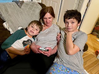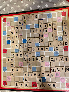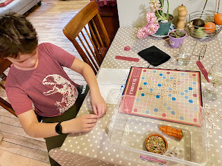 Yesterday, though, across town - Anna needed after-school care. I got the boys at school, got Ben ready to go off with his dad for the weekend, and then played Scrabble with Eli. I haven't played Scrabble in many years, but Wordle has whetted my appetite for making words. I helped him and allowed a few backward words. He won.