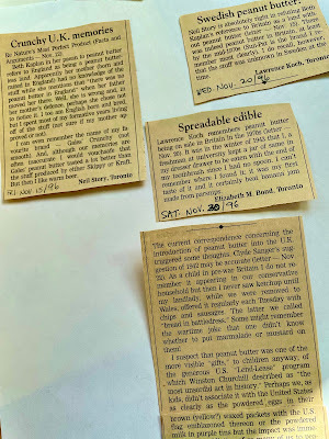 This morning I wanted to check if there were old essays I'd forgotten about for the compilation, so I pulled out the box marked "Mum's collection of my work." I knew she'd kept clippings of my published writing. I didn't know she'd kept scores of each one, sometimes large colour xeroxes or reductions, stacks of them. People sent them to her, too: "Another essay by Beth!!" In an article about my love of peanut butter, I mentioned there was none available when we lived in England; four letters were published in the Globe refuting that claim and listing different kinds of English pb. Mum cut out all the letters, stuck them to paper, xeroxed it many times.