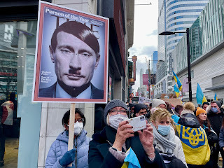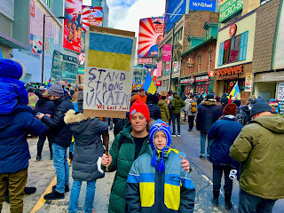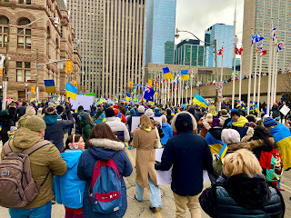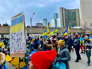 It was incredible; the crowd was vast, thousands, with more pouring in, yellow and blue flags everywhere, wonderful signs, chanting in Ukrainian. We eventually marched to Nathan Phillips Square and then - it was snowing and very cold and very very crowded. We felt we'd done our bit and got the subway north, they to head west and me east.