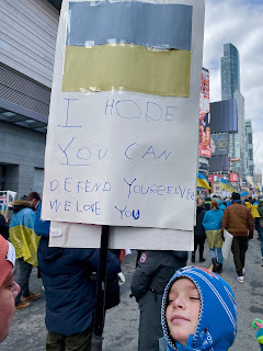 Proud of this city, this country, and so grateful we live here and not in a place where my family is rushing to escape, or sending young men to fight, a vicious psychopathic invader. So when Anna learned there'd be a gathering in support of Ukraine downtown at 2, we decided to meet there. In an hour, she got both her kids to write signs and attached them to a pole and got on the streetcar. I just had a 20 minute walk.