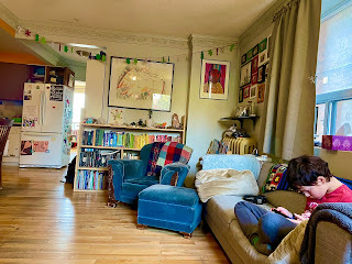Also on the table beside us, in his temporary playpen - Nugget the adorable Christmas hamster. Anna lives in a small apartment with two whirling dervishes and a much loved cat who's incredibly thin, vomits regularly, and refuses to die. And yet, it's always tidy and welcoming and warm there. How she does it, I don't know. Pictures of family and kid art everywhere. In the kitchen, my parents' Danish modern cutlery, my mother's ceramic mugs and Le Creuset cookware. The blue chair belonged to Anna's dad's grandmother. Generations, gathered there, beside a small boy focussed on his hour of iPad time.