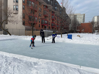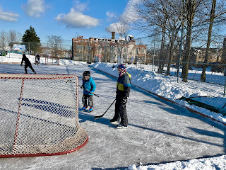 Yesterday's joy — the boys came over and Thomas and I took them skating — well, Thomas skated and I cheered. Neighbourhood parents have created a small rink in a local park, meticulously maintained by volunteers; you can book it in half hour increments and have it to yourself and your party. Eli and Ben are already stronger skaters than last week when I watched. The sound of skates rasping on ice, of a puck slapping the boards - the most Canadian sounds I know.