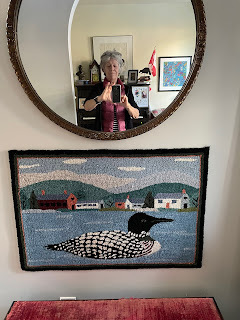 Thomas helped me put up the hooked rug from Nova Scotia that Anna gave me for Xmas. Some old bag took a photo of it. No idea who she is.