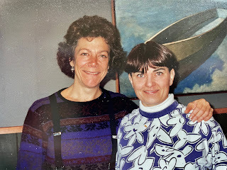 For example, as we dug, I found a photo I'd been looking for, of me with my long lost childhood friend Penny Harris, whose obituary I just found; she died in 2019. I'm writing a story about her, about us. In 1995 I was appearing in a play in Vancouver, my last acting job; she came backstage and we met for coffee. I'd been so stressed I'd lost ten pounds and looked ghastly, and I seem for some reason to be wearing suspenders, but it was joy to meet my old friend again. Memories flooding back, thanks to the photo. Thanks to the piles of the past littering my life.