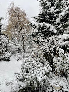 Very beautiful out there - fresh snowfall. Happily, I can enjoy the view from my kitchen chair - a bluejay at the feeder - as I have nowhere to go. And even if I did, I would not go, because I'm still not sure of my health status. My friend the public health nurse pointed out that Omicron can take up to 7 days to manifest, so this cold may still turn out to be the dreaded thing. I'm a bit better today, though, so there's hope. I'll test again on Wednesday. Whatever this is, I don't understand how I got it, with all the distancing, masking, hand-washing. How insistent and strong these viruses are. Powerful enough to cripple the entire world. 9400 new cases in Ontario today. Scary!