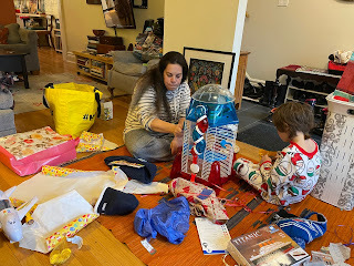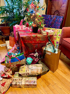 And now, here, we may not be celebrating at all. But I will cook the turkey and there will be presents, no matter what. My tree is very small but my heart is big. At this point, I wrap everything. I bought a bag of Thomas's favourite almonds at the market yesterday; they're under the tree. Now time to fill the bird feeder, so everyone, with feathers and without, has enough. At least, everyone around here. How very many, I know and I mourn, will not have enough.