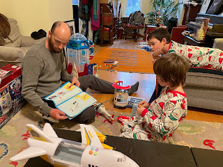 For many years, we always had guests - my parents or other relatives, people we called homeless waifs, who needed a friendly place at Xmas. But recently, just us. Though it was so low-key, I still find it stressful, hoping everyone is content and full. Anna was thrilled with her Christi Belcourt print, and Sam, who loved his visit to Ireland years ago, with his W.B. Yeats framed poem - "Tread softly, for you tread on my dreams." Thomas spent much time assembling a Lego Titanic with a million little pieces - it said "For 6 up," what a joke! - and the Playmobil rescue centre with helicopter and boat. There wasn't a single argument about anything. The boys played quietly for what seemed like hours. The fire made us all overheated. Dinner was wonderful. It was all the best.