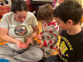 I'll sit by the fire and read. Perhaps I'll write in the journal Anna gave me with the beautiful fountain pen from Lynn, wearing my new lambswool scarf from her. Anna also gave me a gorgeous hooked rug from Tatamagouche, Nova Scotia, and Sam a special pillow that's supposed to help with sleep - how well they know me. The hamster, now called Little Hamlet the Fearless, was the best present for the boys. When they got home with him in his big plastic house, he was the source of much interest from Naan the cat. "Oh thank you for bringing me this delicious snack!" Sam said in Naan's voice. "Just how do I get the wrapping off?"