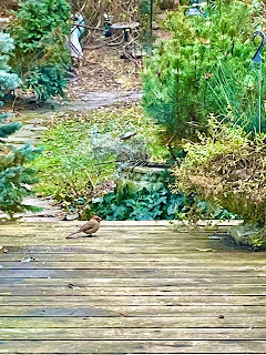 Here, yesterday, before the snow, is Lady Cardinal on my deck. Wish you could see her flashes of red - her red beak - her perky crest. She's my favourite.
