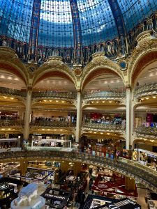 And then, because shallow, off on the bus to another sacred place: Galeries Lafayette, a sparkly cathedral not of faith but of consumption. Did a bit of shopping and went up to the roof for the first time, to look at the view — just me and hundreds of others and their cellphones. Endless endless cellphones. Endless slate grey roofs, the immense Opera building right in front, and the Tour Eiffel, naturally, in the distance.