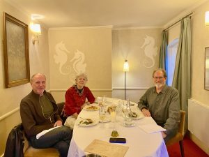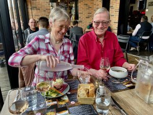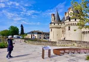 Home for a pit stop, and then a 20-minute walk along country paths to a gourmet restaurant, also a wine shop; I was taking my hosts for lunch to thank them for their kind hospitality. OMG! A superb meal. I had the daily specials: mousse of beet mixed with local chèvre, to die for. Pork with veg. A dessert medley with espresso. Accompanied by two bottles of wine — a frisky rosé and a Chinon with the meal. Let me tell you, more lunch than I’m used to, and far, far better.