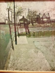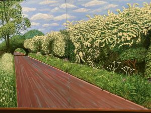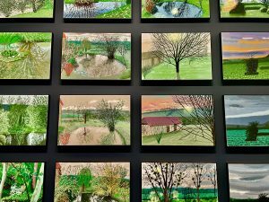 He moved around the world. His California paintings are perhaps his most famous, the swimming pools and the multi-coloured highways. But then he moved back to England and captured his home country in many paintings and sketches, often of the same place in all seasons; then he lived in Normandy for some time and painted that. He studied and honours great artists of the past; some of his background slashes look like Van Gogh’s skies.