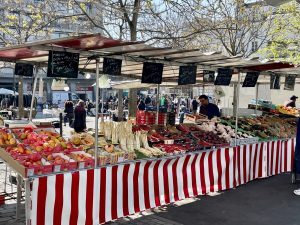 This morning we walked ten minutes to the Sunday market, which had me swooning with pleasure. We were the only non-natives as the French lined up for cheese, veg, meat, fish. And of course bread; I bought our dessert for today’s Sunday lunch, a selection of patisseries, I’m drooling just thinking about them. As part of their Sunday ritual, we sat in a marvellous café. I’m ashamed that although they had rosé, I ordered a grand crème. I just couldn’t drink rosé at 10.45 a.m.