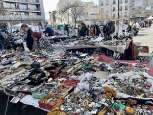 This morning, the Ligne 1 metro to Bastille, then walked along the Faubourg Ste. Antoine — this area is the real Paris — to the Marché d’Aligre, a flea market, scores of tables laden with junk and treasure, chipped dishes, broken ashtrays, faded handbags, shoes, books, posters, silver, jewelry, Arab vendors shouting at each other, the usual bunch of savvy pickers and weirdos like me sifting through. Luckily I cannot buy anything because my suitcase is too small. I once bought a lovely little bowl here, that gives me pleasure every time I use it. But today, just the pleasure of being there. There is also a big food market, veg, fruit, cheese, meat — white asparagus — beautiful.
