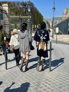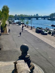 I happened to be here in April 2019 when she burned, saw the fire from a bridge, came the next morning to stand and weep with the crowds and smell the char in the air. Now she’s magnificent again. I will try again to get a reservation — you need to book to get in if you don’t want to stand in line — but it’s difficult, they say between 10 and 15 thousand people a day book to visit, and I have always missed. But I sat and looked at her and realized this time one reason she is so stunningly beautiful, besides her perfect symmetry — she is solid and yet delicate. Her arches, windows, carvings, statuary – delicate, intricate. Yet she has stood squarely, solidly there for over 800 years, and will stand, we hope, for at least 800 more.