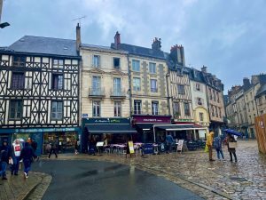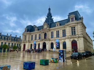Pix: Poitiers’ town hall sous la pluie, with drenched wedding guests, and a square. Lesley and Duncan in line at the boulangerie. The café, full of interesting things to look and laugh at, run by a father and son, very friendly. And last, the view from my bedroom window in today’s brief, appreciated bit of sun. Can you beat it?