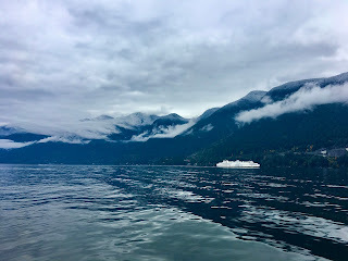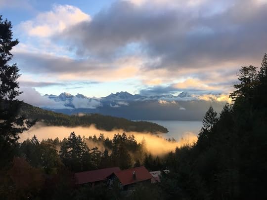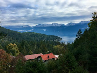 The view this morning - a brief lifting of the clouds before the rain comes back until Monday. Snow on the mountains for the first time, Shari says. We leave today for Whistler where it may actually snow. And me with only my red rain boots. Stay tuned.