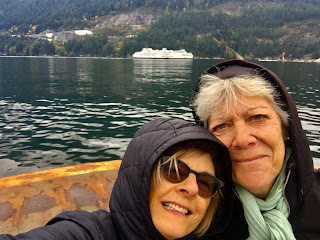 Wednesday midday we got the noon ferry to the mainland, drove to her musician daughter's in North Van to pick up a laptop she'd forgotten, then did a U turn and headed to Whistler, in the mountains, and what a spectacular drive that is. Whistler is a sports resort - hiking, skiing, boarding. There's more snow, every day, moving down the mountains, and it's colder than I'd anticipated. In fact, the whole trip has been colder than I'd anticipated. I've been wearing layer upon layer – an undershirt, a thin turtleneck, a t-shirt, a cardigan, a vest. Ridiculous, but necessary. And my ridiculous rain boots.