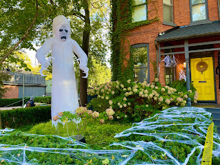 Gloomy and wet today; fall is here in full force. All the wintering-over plants are inside, dropping their leaves and begging for water. Everything is shutting down. Several friends are sick with colds. And this neighbourhood is littered with severed plastic hands and legs and heads, ghouls, monsters, giant spiders. They go big for Hallowe'en around here.