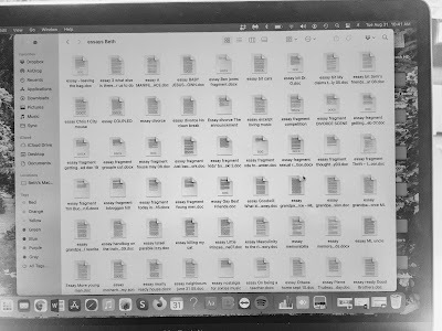 On a brighter note, I spent two solid days moving files around, creating new folders, renaming files to drag into the new folders, opening old stuff to see if it should be stored or transferred to the trash, which makes such a satisfying sound as it sucks in detritus. I feel SO ORGANIZED! However, the work also depressed me, since it showed, again, just how much writing I did for years and years without sending any of it out. In the nineties, I had lots of essays published, and then I stopped, thought if I was working on books, I didn't have time for essays. I started them anyway and left them littered about in bits and pieces in Documents. Now they're in a folder, and the challenge is to do something with them.