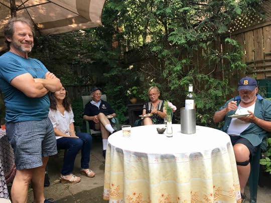 0nce I got out of hospital, I thought I'd be fine to produce a simple gathering in the garden. But I was not fine, so Anne-Marie stepped in, did almost all the shopping and made banana bread, and Sue LePage prepared some of the treats. There was a lot of food, wine, beer.