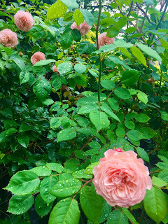 I came out to the deck, and what I saw, with all the beauty, was everything that needed to be done. The big outside room had exploded with growth in five days. I wrote to John and asked if he might possibly have time to come help, no rush, anytime or tomorrow. "I'll be over soon," was his reply. I wept. We talked and talked, as we always do, and then he cut the grass, tied back the roses that were falling over, transplanted and pruned. I wept. He's coming back Friday to do more. And now, after a day taking care of my grandsons, Nicole has come to clean, as I have no energy even to wash a dish. Yesterday Jean-Marc came over with soup, took out my recycling bins and brought them back this morning, and soon he's coming back because the wire gate to the veg garden is stuck and I cannot move it.