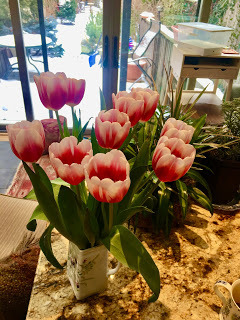We singletons pay no attention to this maudlin day - though I did go to the Epicure to buy a ton of sourdough bread, Quebecois cheese, and a Dufflet lemon tart which is simply divine. Treats! And these tulips are a gift from my beloved friend Anne-Marie, glowing in my kitchen.