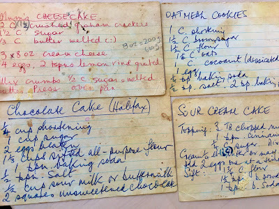 A big day Sunday - the family came once more to toboggan and to dine. My local butcher was closed last week so I asked John to buy me a good quality roast at the market - he bought a five pound prime rib, better quality than I'd ever have bought myself. I made a crust of garlic and rosemary and baked it rare. While cooking, I looked up some old recipes and found these fave recipes of my mother's, 3 in her writing - much loved as you can see. She made that chocolate cake with sour milk every year for my birthday, and I used to make it for my kids. The cheesecake is mentioned in my memoir; I made it the first time I met my future in-laws. Mum had neglected to mention that it needed nearly an hour in the oven.
