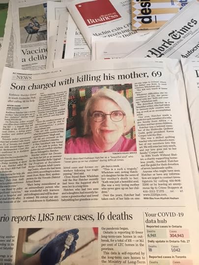 Today was an exciting day - I got my new modem from Rogers, had to install it myself with the long-distance help of Brad, friend, writing student, and tech guru. I hope now my Zoom classes will be more seamless, with no freezing or lags. Have to install a new cable box for the TV but will do that tomorrow - only so many tech challenges a girl can stand in one day.I'm trying to write an essay about last year. The Star publishes writers' thoughts on Covid times every Saturday, so I thought I'd submit something. But it's hard to write about this without sounding entitled and out-of-touch - because in the midst of such misery and turmoil, I had a startlingly good year. And yet I think there are a lot of people who feel like me. No problem having to stay in my beloved house with so much pouring in from the internet. Cross Country Checkup was about Zoom on Sunday, and I gather many in isolated communities complained about their terrible internet access. Here, no complaints. I did not have to go out to work or worry about loved ones in longterm care or look after young children stuck at home; my work continued almost without pause on Zoom, and I was thrilled with how much easier Zoom made many facets of life. I know, incredibly lucky. How to say that without offending the countless people who suffered terribly last year?