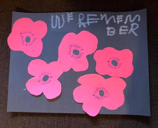 But Anna did much better. She and Ben created this. On one poppy, my mother and her sisters, on another my father and his brother, on another my in-laws, and then a soldier of colour who died under difficult circumstances and an Indigenous WW1 nurse.