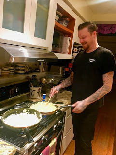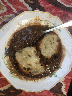 Yesterday's treat: the giraffeman came to cook a huge vat of French onion soup. Four bags of onions caramelizing - divine. Soul food.