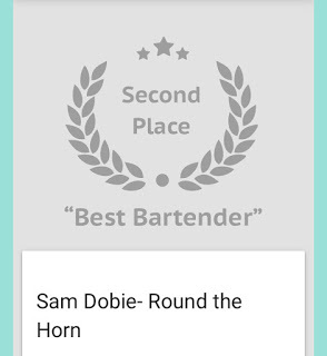 Then an even greater triumph: Sam Dobie the runner-up in the Best Bartender competition. He is the second best of the hundreds of bartenders in all Toronto, and in one of the smallest bars in the city! Bravo my son. Too bad you're now not able to do what you do.